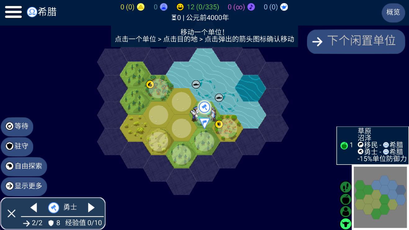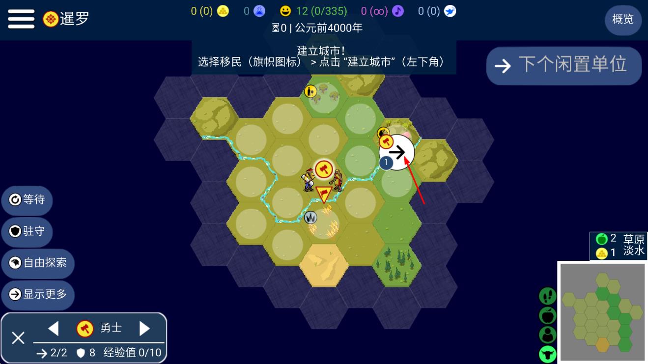 2、操控【勇士】沿箭头移动,探索标有【2-草原-1-淡水】的格子,拓展领地解锁区域。