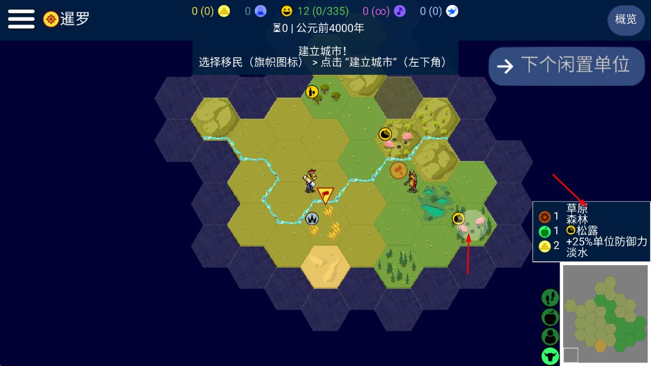 3、让单位抵达【松露-森林】区域,借助【+25%单位防御力】加成,勘察资源助力建城。