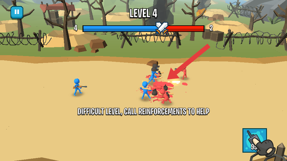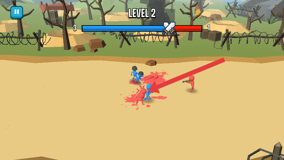 1、进入LEVEL2,蓝色小人部队与红色敌人交锋,优先集火箭头指向的敌方单位,快速削减其战力,为胜利奠基。