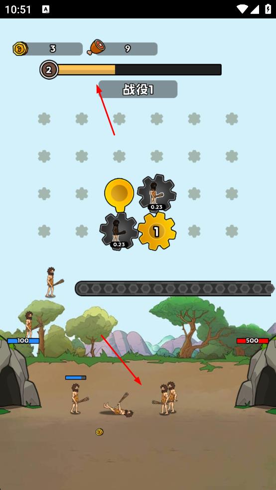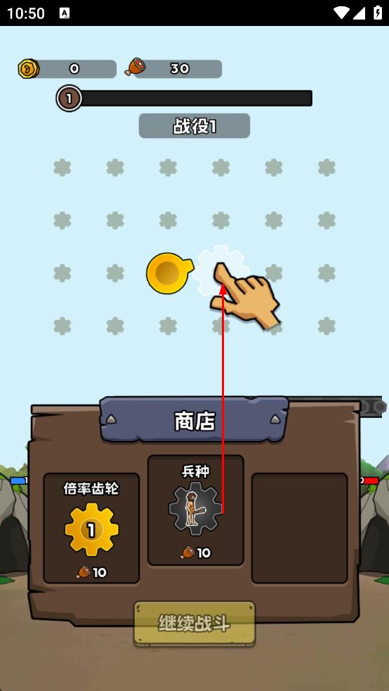 3、升级循环升级后解锁更高级道具,重复购买战斗升级,推进战役1等关卡。