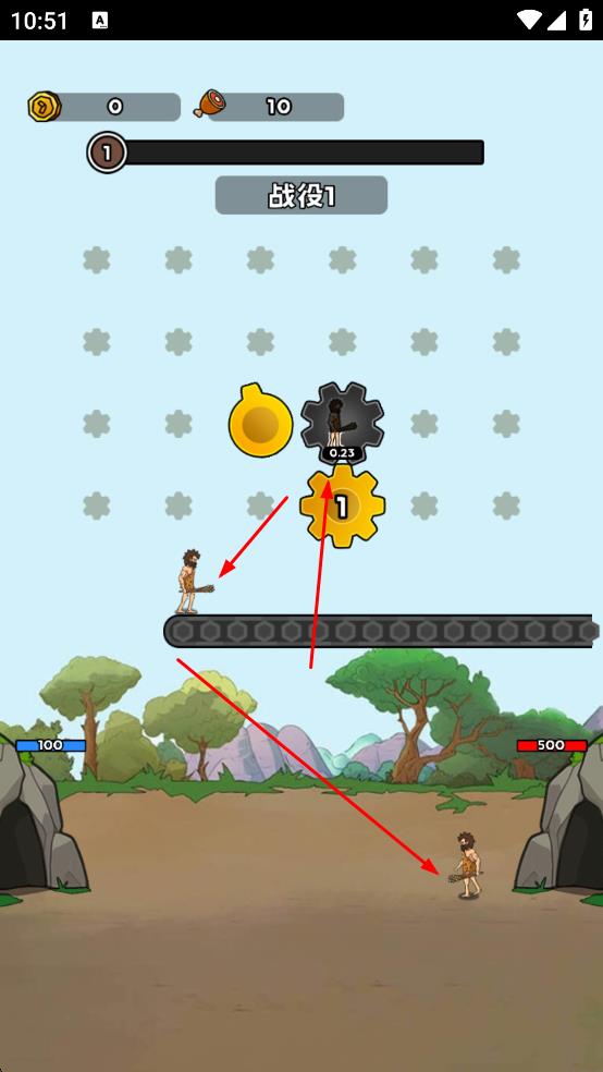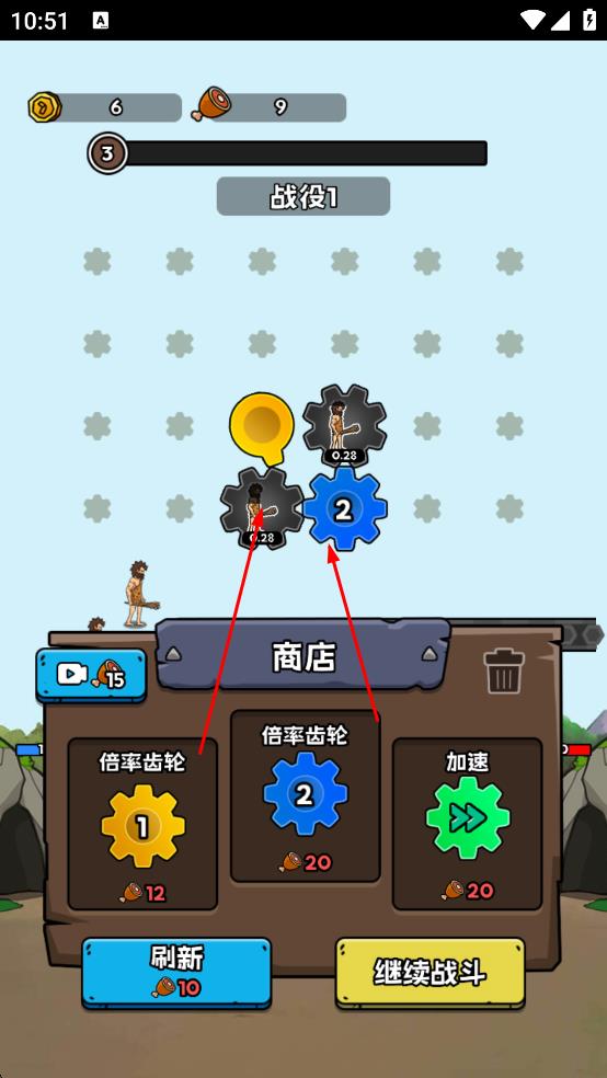 1、资源消耗肉在商店购买兵种原始人、倍率齿轮、加速道具。