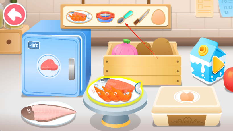 1、查看上方食材栏,明确所需食材,如鱼、切模等,点击对应食材和工具,像选中盘中鱼虾。