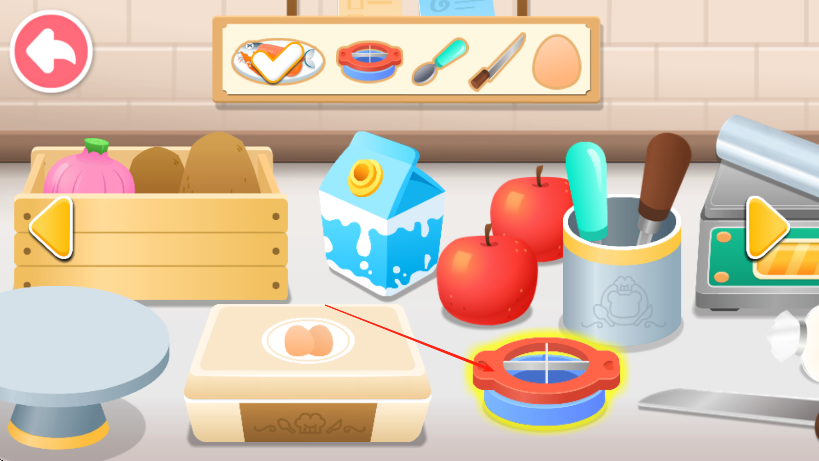 2、按顺序操作,拿到食材后,找到并点击下一步所需工具,如红色切模进行处理。