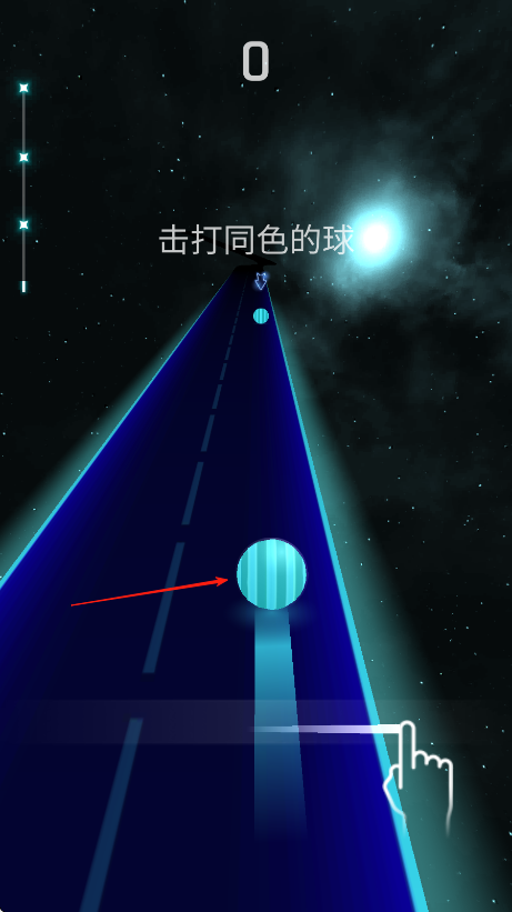 1、进入游戏,沿道路前进,看到同色的球,如蓝色球,点击击打,获取分数。