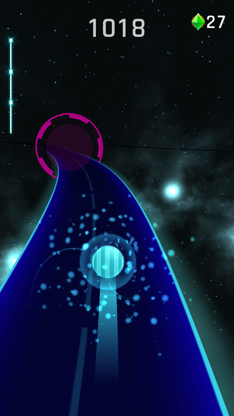 3、随着游戏推进,注意道路颜色和障碍物变化,如道路变红时,击打同色红球,持续挑战更高分数。