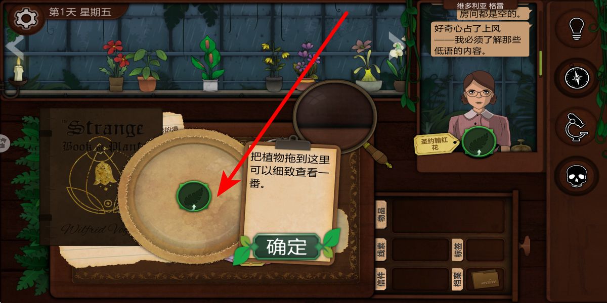 1、获得植物后,将其拖至查看区域,依据提示细致查看,完成识别流程,获取植物信息与奖励,为解谜积累关键素材。