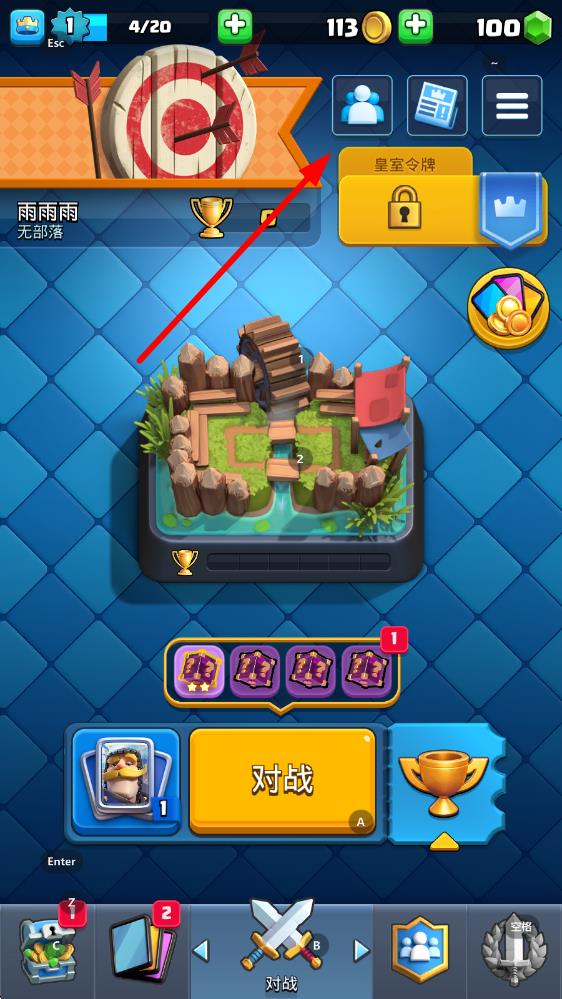 1、打开皇室战争游戏主界面,点击界面上方的社交图标,进入好友页面。