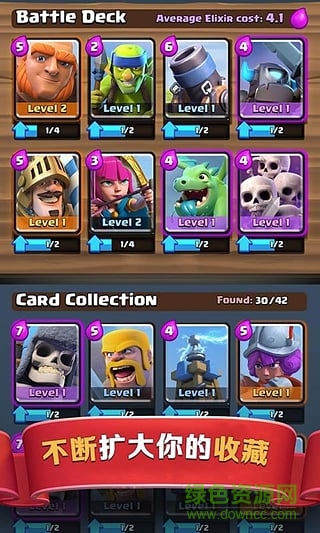 您可以收集并升级几十种你所熟知和喜爱的《部落冲突》的军队,法术以及防御建筑卡牌,还有同样令人喜爱的皇室家族人物:王子,骑士,飞龙宝宝等等。