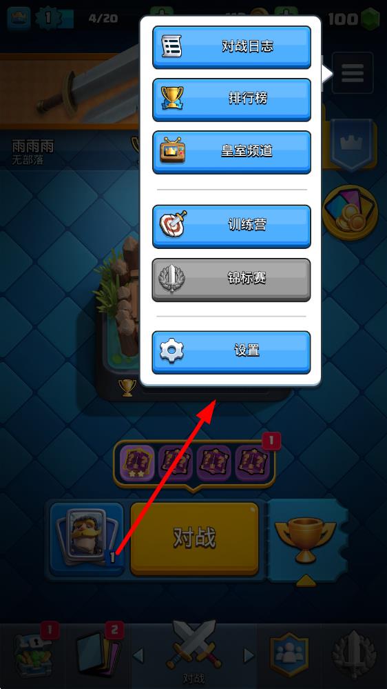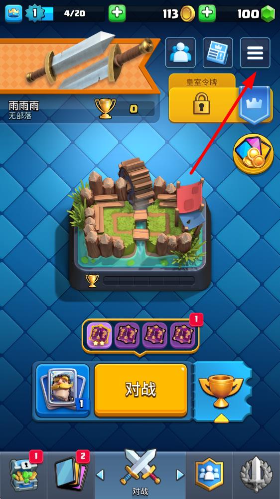 1、进入皇室战争游戏主界面,点击右上角三条横线样式的菜单按钮,展开功能选项列表。