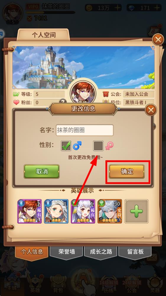 3、在更改信息界面里,找到性别选项,点击想要更换的性别图标,选择完成后点击确定按钮,首次更改是免费的。