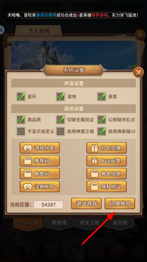 3、在系统设置界面下方,点击切换账号按钮,游戏会返回登录界面。