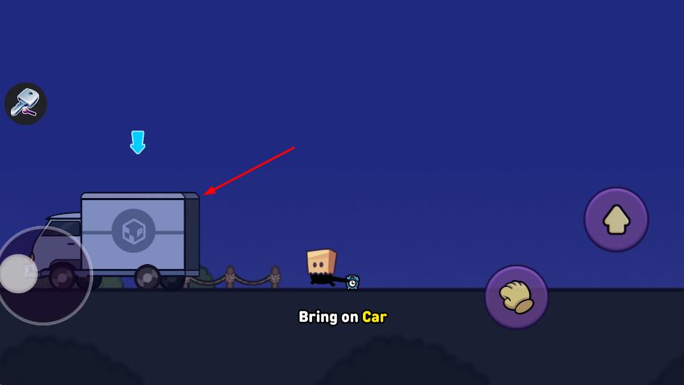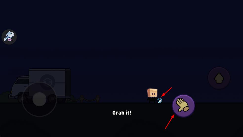 1、进入游戏界面,通过左侧虚拟摇杆控制角色移动,朝着时钟图标方向前进。