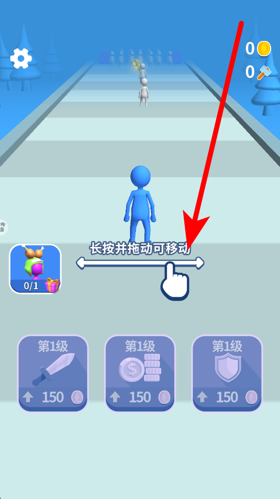1、开局长按并拖动屏幕下方移动条,控制蓝色角色左右移动,在赛道上撞击白色小人,让其加入队伍,注意避开障碍,保持队伍前进。