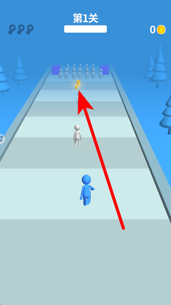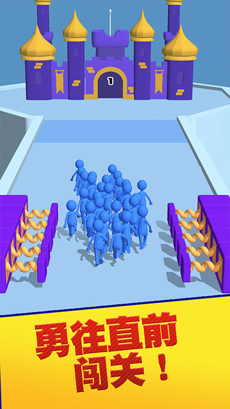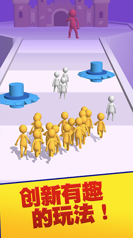2、队友收集操作:在闯关途中,留意场景中的白色小人,主人公主动撞击它们,被撞击的白色小人会变成队友跟在身后,逐步扩大队伍规模,为终点战斗做准备。
