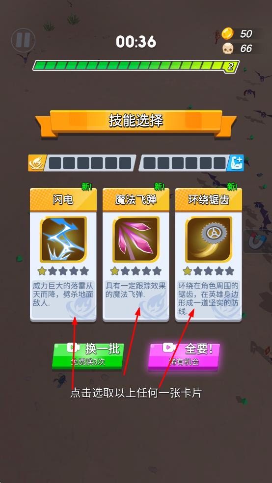 2、技能抉择每级解锁技能闪电、魔法飞弹、环绕锯齿,定制战斗流派。