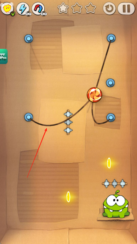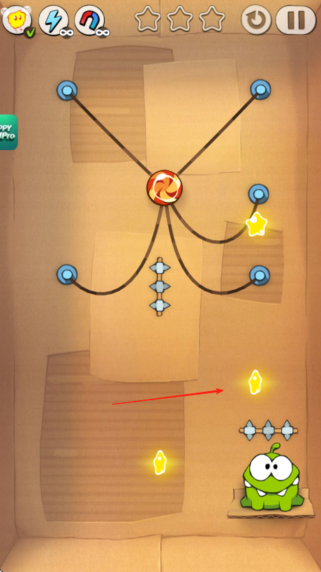 1、绳子切割策略:观察关卡中绳子的连接方式与数量,判断先切断哪根绳子能让糖果沿理想轨迹移动,避免因切割顺序错误导致糖果掉入障碍或无法到达目标位置。