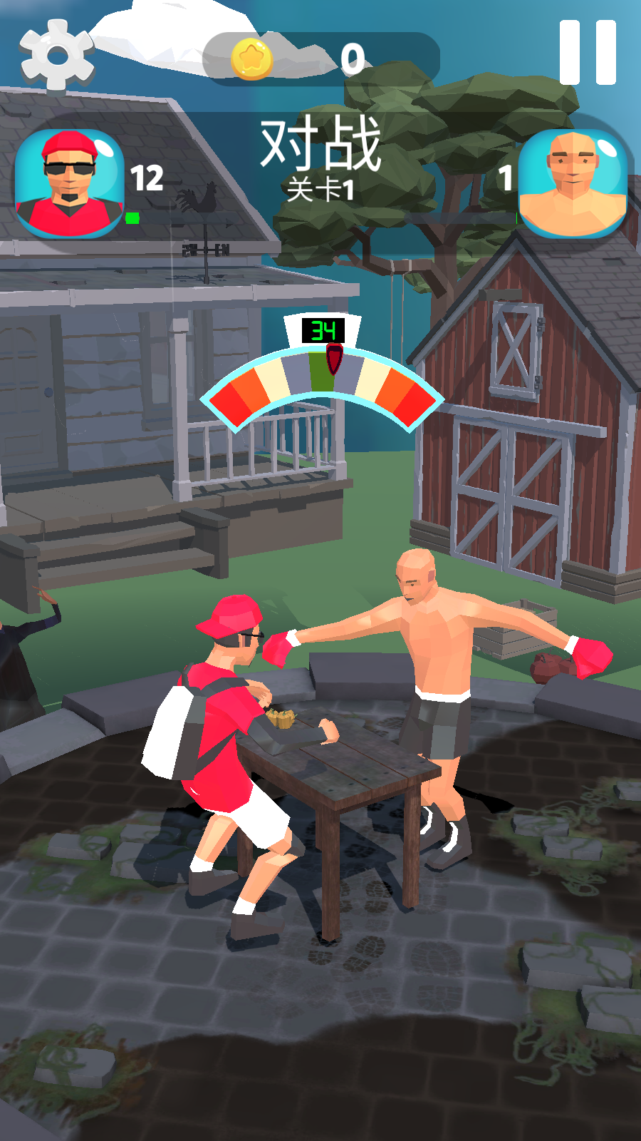 1、进入对战关卡1,查看屏幕上方双方的血量条和分数,明确当前对战状态。