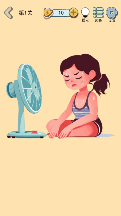 2.第一关你可以看到女孩子很热,你要想办法把电风扇打开,正常的打开开关就可以了。