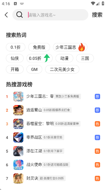 7、而且顶部的搜索功能也是非常好用的,如图所示。这里能提供搜索热词,以及热搜榜单。能很好的呈现全网游戏的流行风向和趋势。