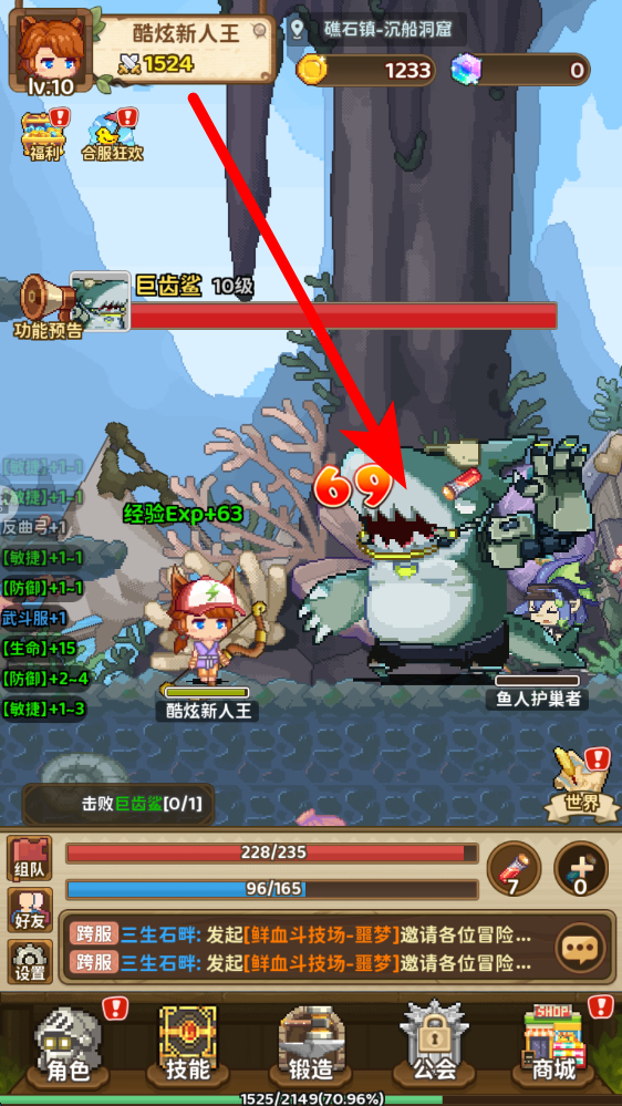 2、进入沉船洞窟的场景,挑战首领怪物巨齿鲨,合理释放角色技能,把控战斗时节奏,成功击败后解锁新内容,提升角色的实力。