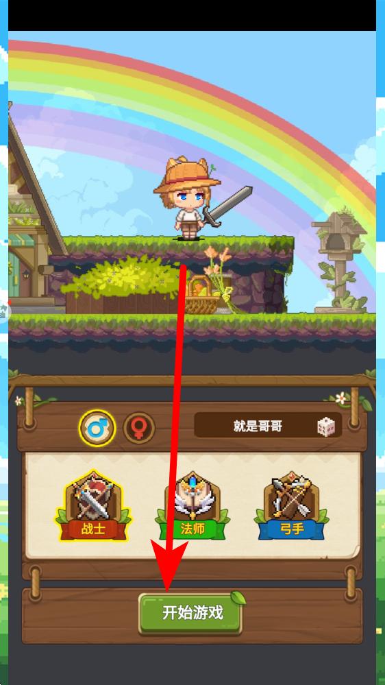 1、在初始界面,选定战士、法师、弓手任意职业,输入昵称后点击开始游戏,创建专属角色,正式踏入枫叶岛异世界,开启探索篇章。