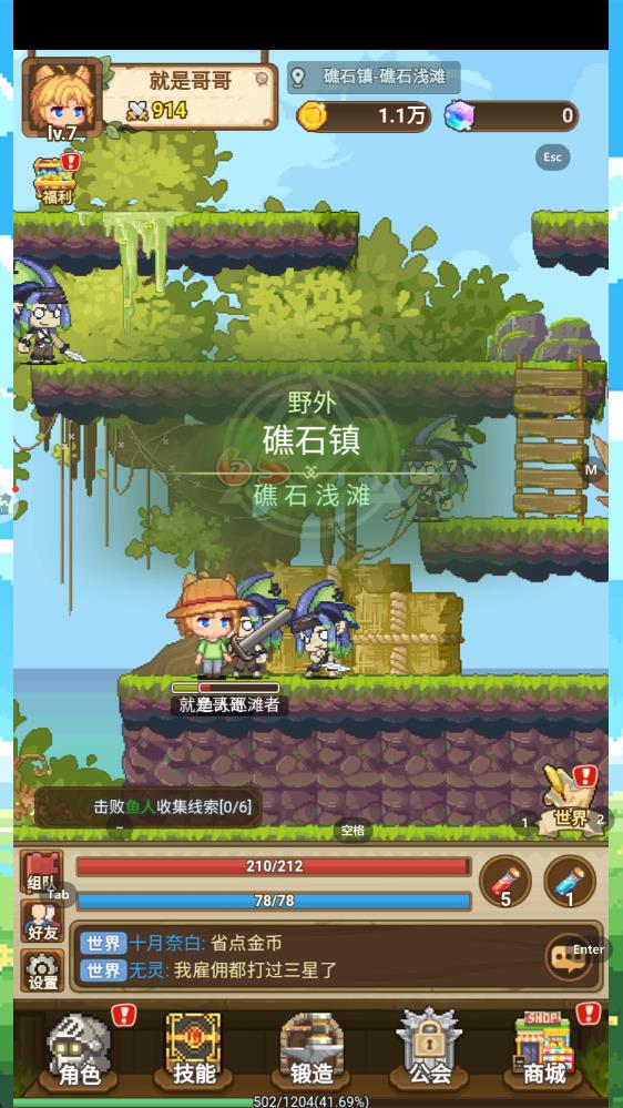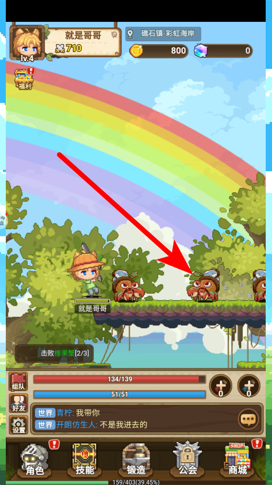 2、进入游戏后,前往野外区域礁石镇到彩虹海岸,遭遇修果蟹等怪物,主动攻击完成击败修果蟹等任务,获取经验与基础资源,推进角色成长。