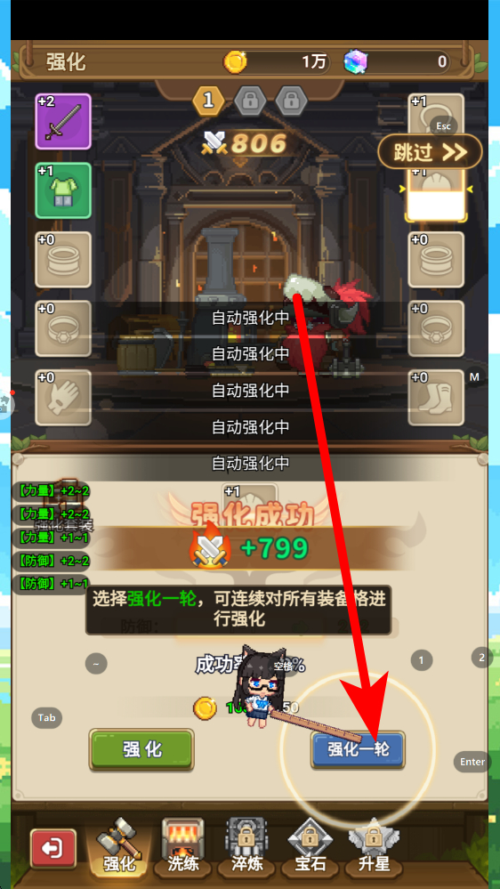 3、积累一定资源后,进入锻造界面,点击强化一轮按钮,消耗金币对装备批量强化,提升装备属性,增强角色战力,为后续挑战做准备。