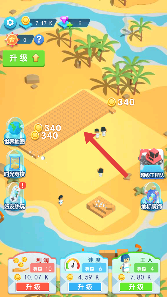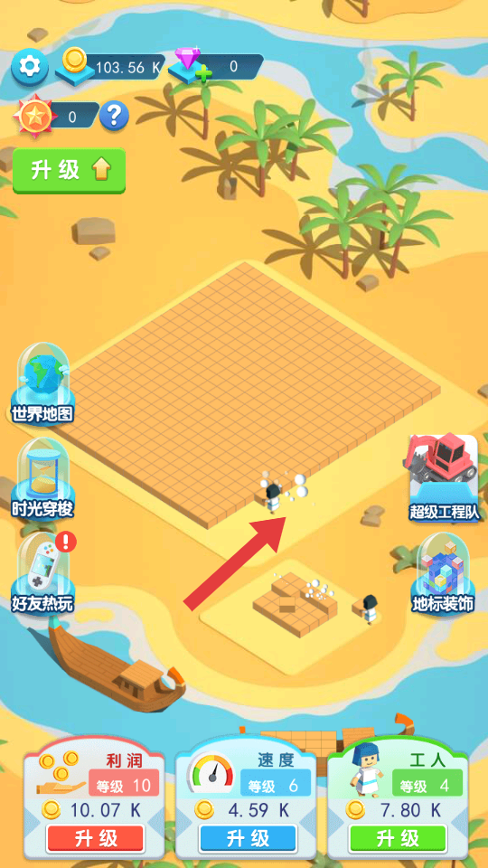 3、持续用金币升级利润,增加资源获取效率,循环升级工人→选地块建房→升级速度流程,填满方舟网格。