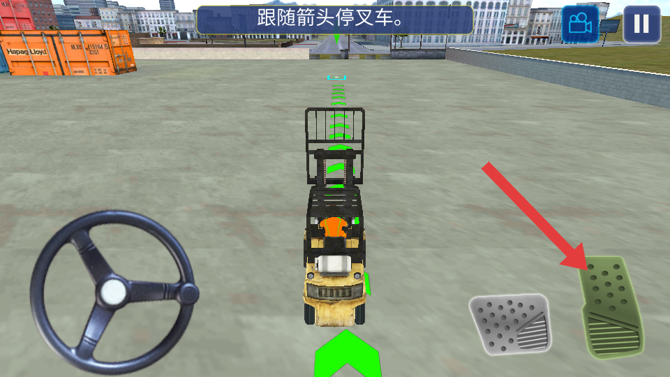 3、任务中注意观察叉车状态,遇转向、搬运不顺畅时,微调方向盘和踏板,保持低速稳行,通过两类基础任务。