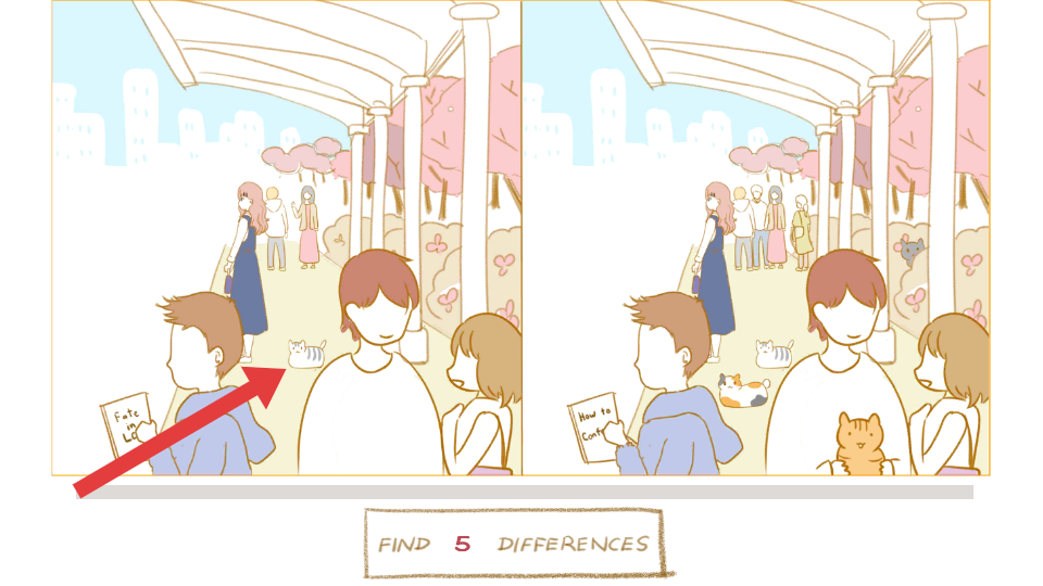 1、进入找不同游戏,聚焦找5处不同的左右场景,从显眼元素入手:观察人物数量,动物种类,标记前2处差异。