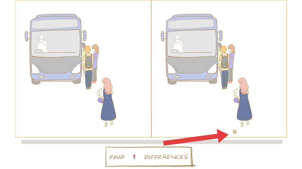 3、面对另一组找1处不同的场景图,聚焦细节元素,如公交站广告的内容、地面的标识,精准的定位差异点。