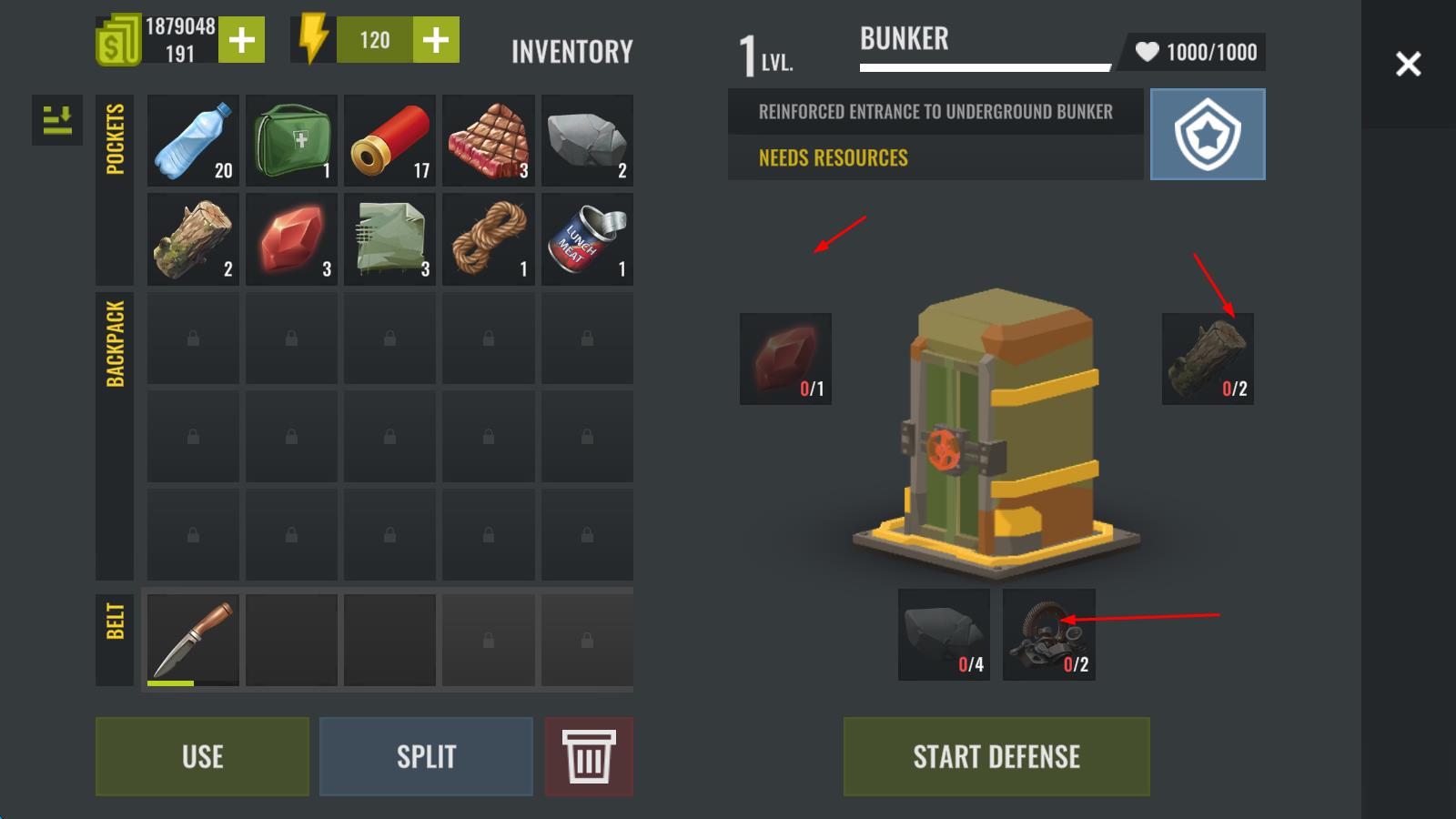 2、进入仓库界面,查看地堡升级所需资源,从背包中选取对应材料,为地堡防御做准备。