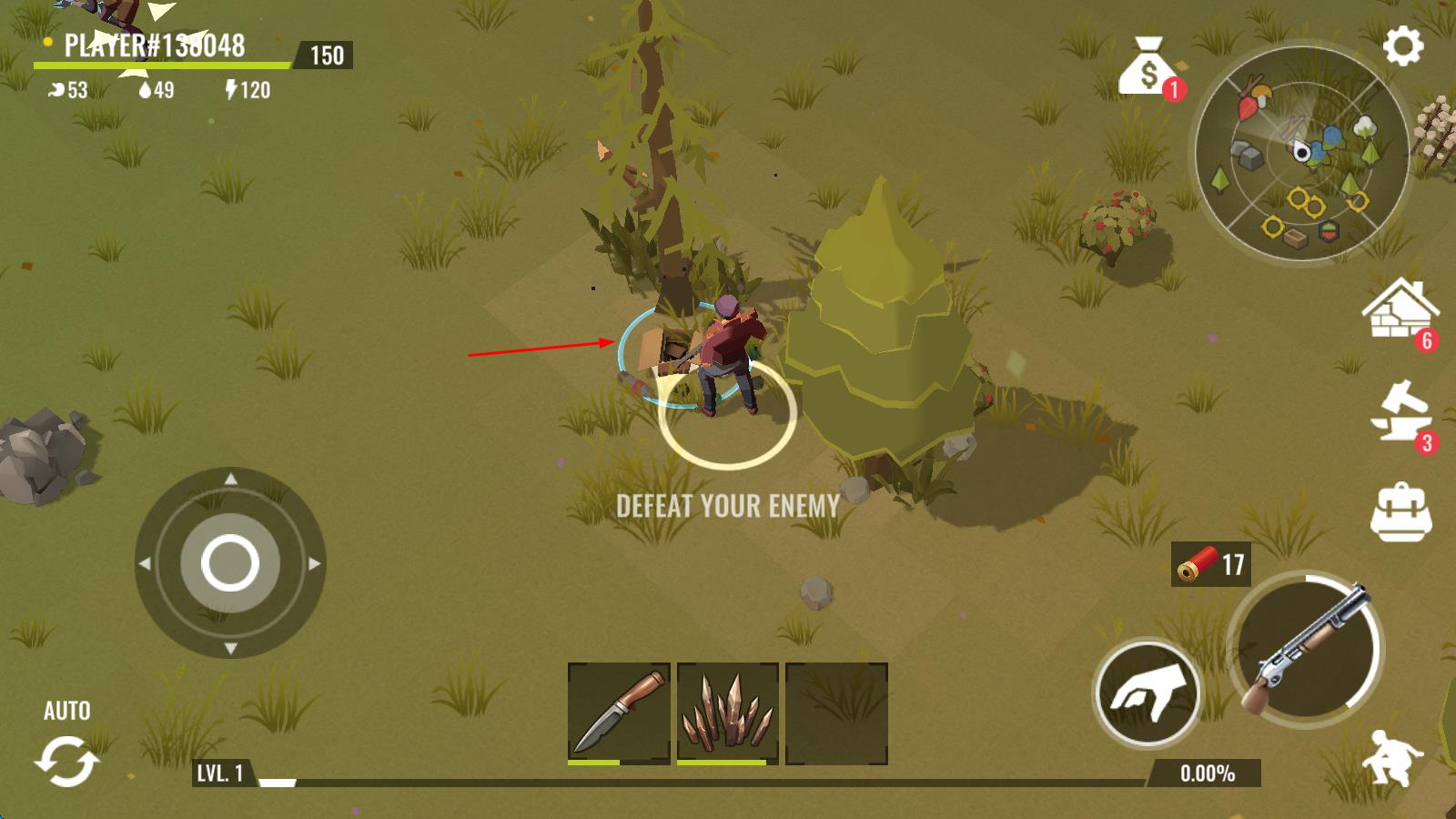3、回到野外场景,操控角色靠近树木物资点,点击收集按键收集物资为后续的危险做好防备。