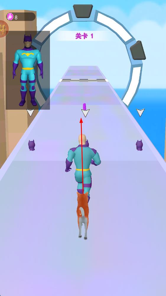 2、在跑道上,引导角色冲向紫色道具,让角色逐步集齐机甲部件,靠近道具时自动获取。