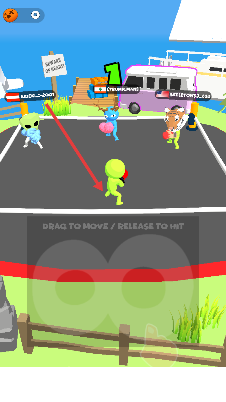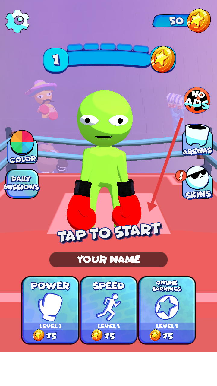 1、点击TAP TO START开启,操控绿色拳击角色,在户外场地对战其他角色,利用DRAG TO MOVE / RELEASE TO HIT机制战斗。