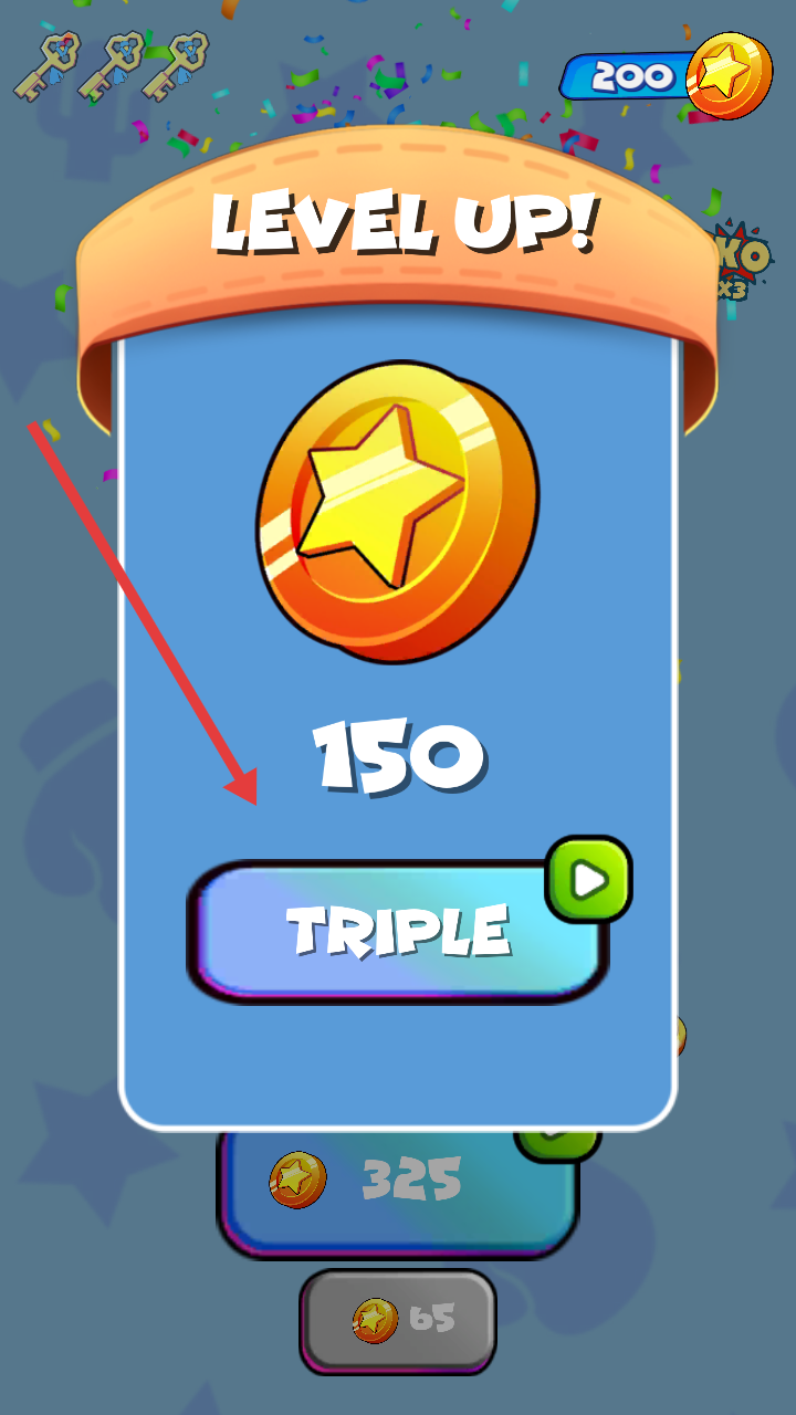 2、拖动屏幕移动角色,松开触发拳击,击败对手后,触发LEVEL UP奖励界面,可选择领取金币或看广告获取更多。