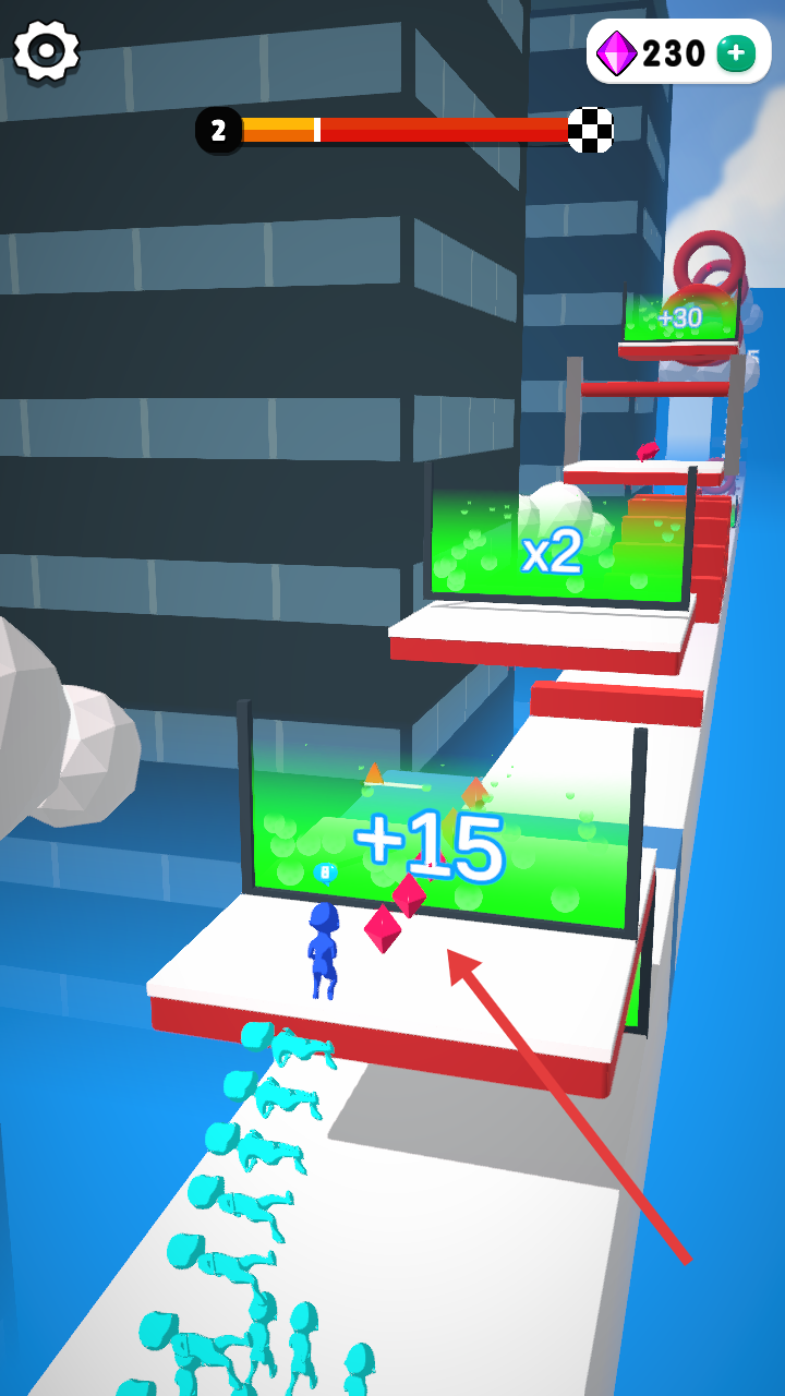 2、遇到分层跑道,引导队伍跳跃到上层,获取x2等特殊增益,壮大队伍规模,注意躲避障碍。