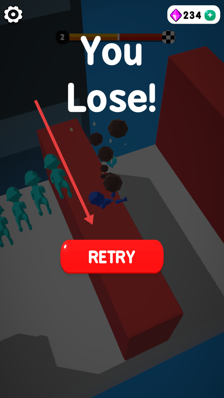 3、失败YouLose后,点击RETRY重玩,优化路线,让队伍稳定通过关卡,抵达终点旗。