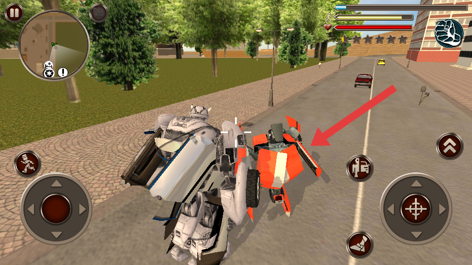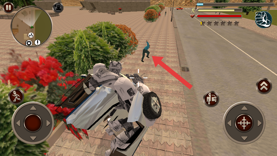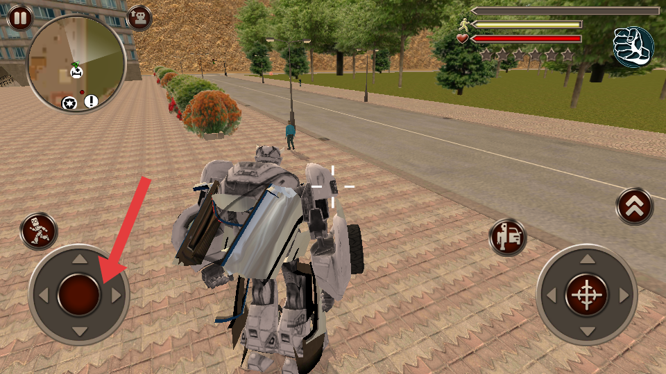1、进入游玩的页面操控机器人在城市街道移动,左侧摇杆控制方向,遇到行人、车辆可互动,熟悉基础移动与交互。