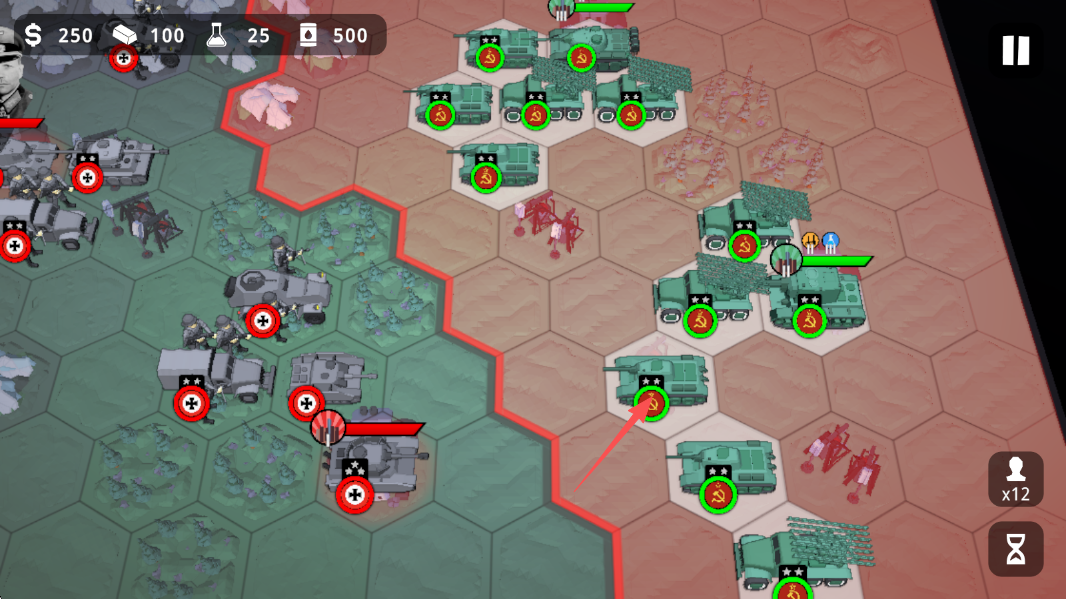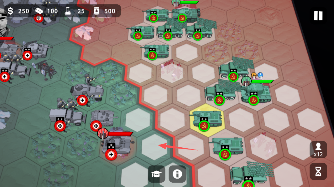 1、战斗时观察【绿色坦克】位置,依箭头指引调动单位,利用六边形格位推进,压制敌方阵地。
