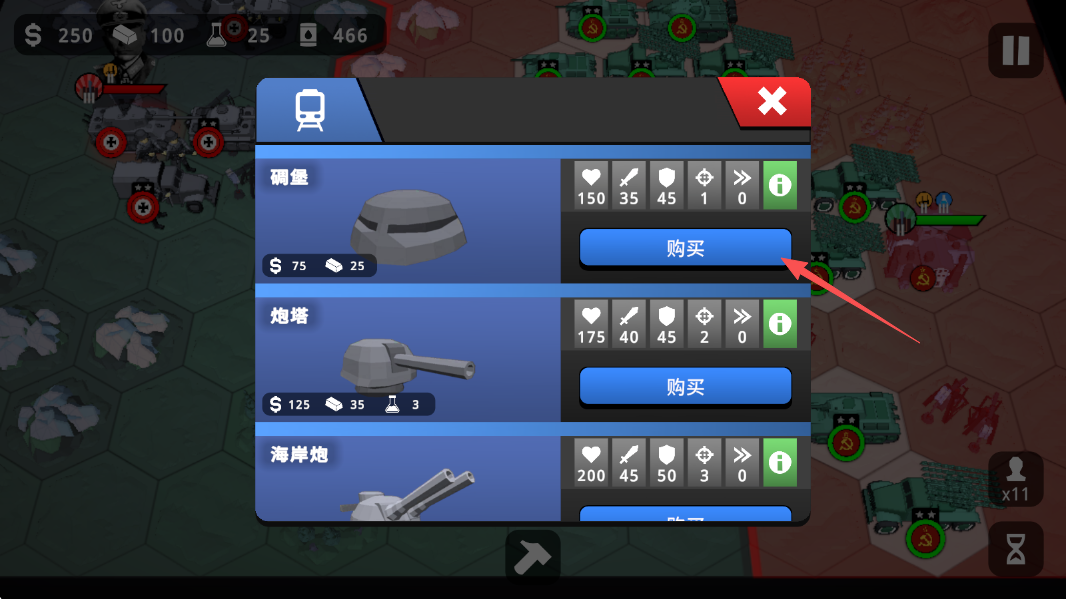 3、消耗【$75-25】资源购买【碉堡】,依托防御建筑构建阵地,提升部队生存与反击能力。