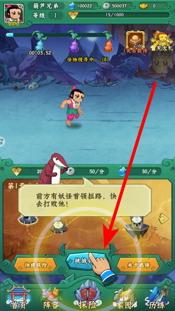 1、新人进入探险界面,当提示前方有妖怪首领拦路时,点击挑战令按钮,触发首领挑战流程,进入战斗准备阶段,开启与妖怪首领的对决。