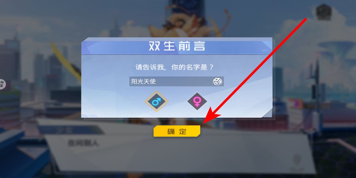 1、在双生前言界面,先确认预设名字,也可自行修改,选定性别后,点击确定按钮,顺利完成角色身份创建,正式开启冒险。