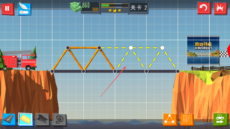 2、查看屏幕上方的金钱数860、关卡数关卡2等信息、利用下方材料按钮规划搭建桥梁结构。