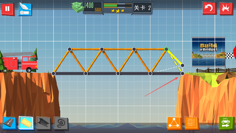 3、持续调整桥梁搭建方案、确保桥梁稳固能承受车辆重量、成功让左侧车辆抵达右侧终点过关。