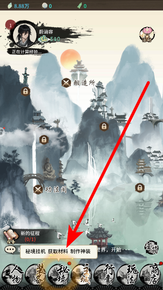 2、进入主界面后,点击下方秘境按钮,参与秘境挂机玩法,通过该途径可获取制作神装的材料,为角色战力提升、装备打造积累资源。