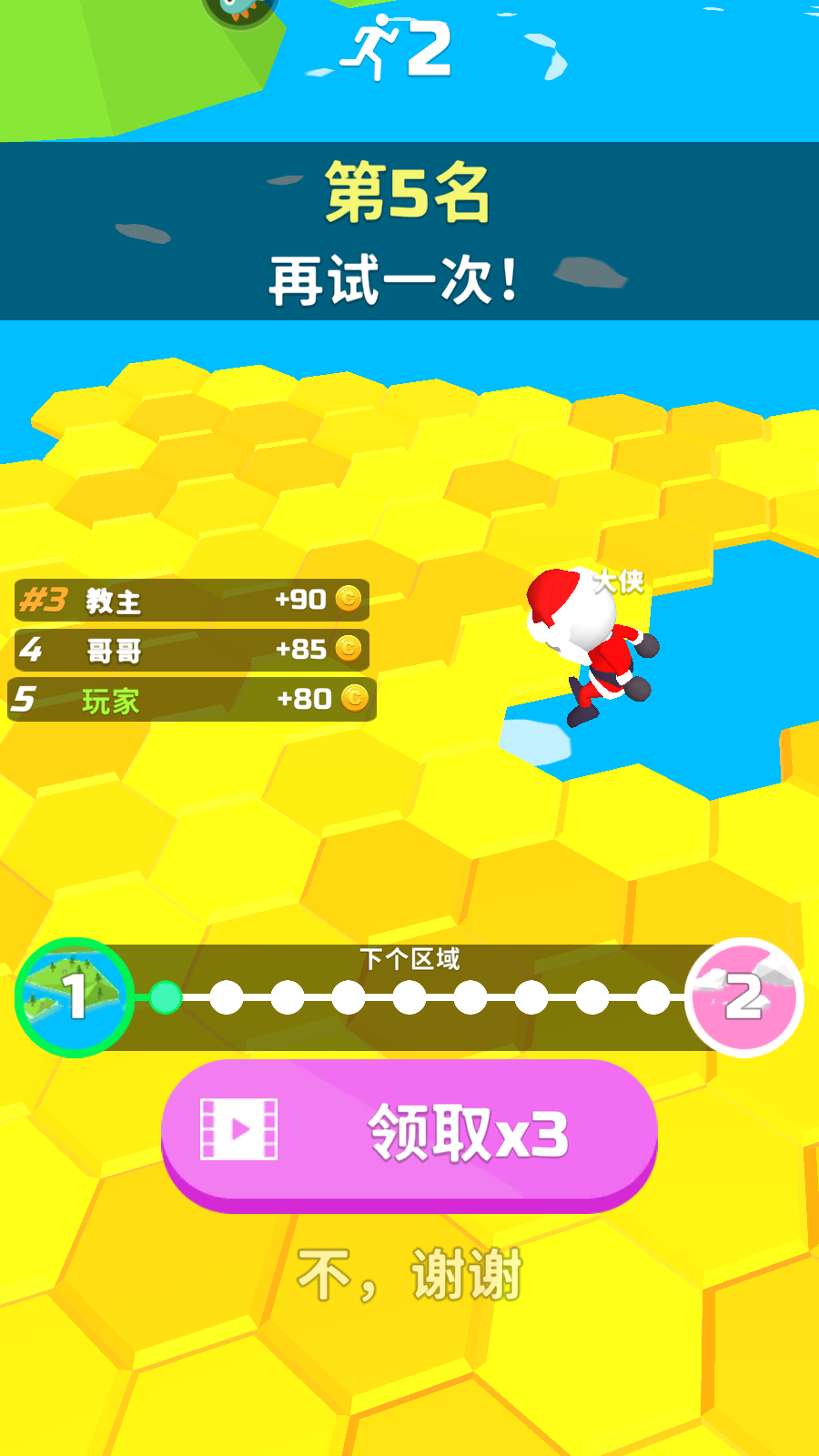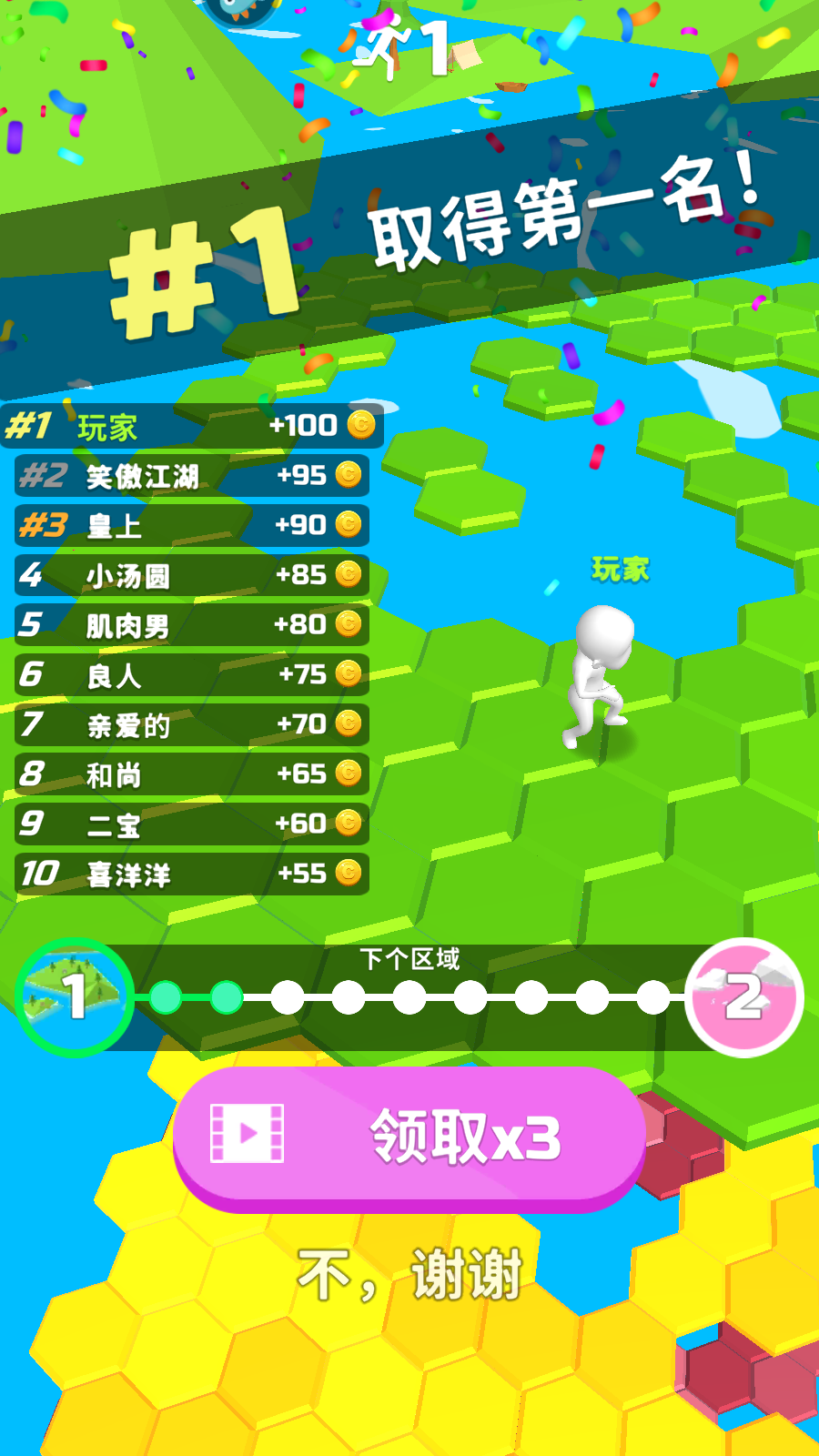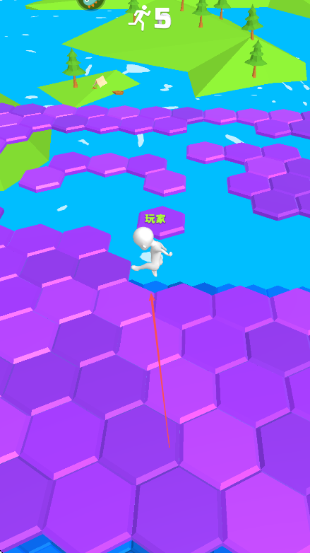1、进入游戏,操控白色小人在紫色六边形平台上奔跑,留意上方显示的跑步计数。