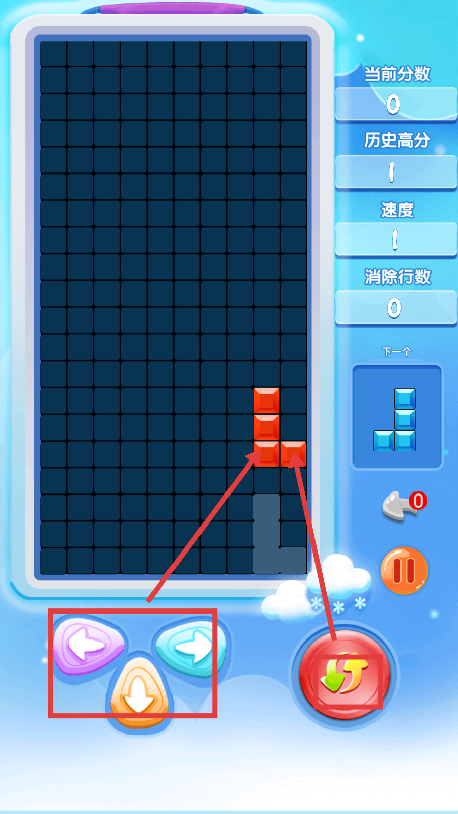 3、堆砌时凑满整行消除-通过【消除行数】涨【当前分数】-维持合理布局防堆积。