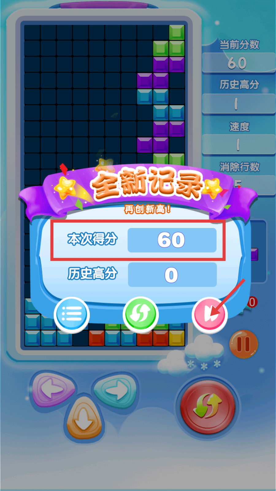 4、结算看【本次得分-60】破纪录-点继续按钮再挑战-冲击更高历史新高。