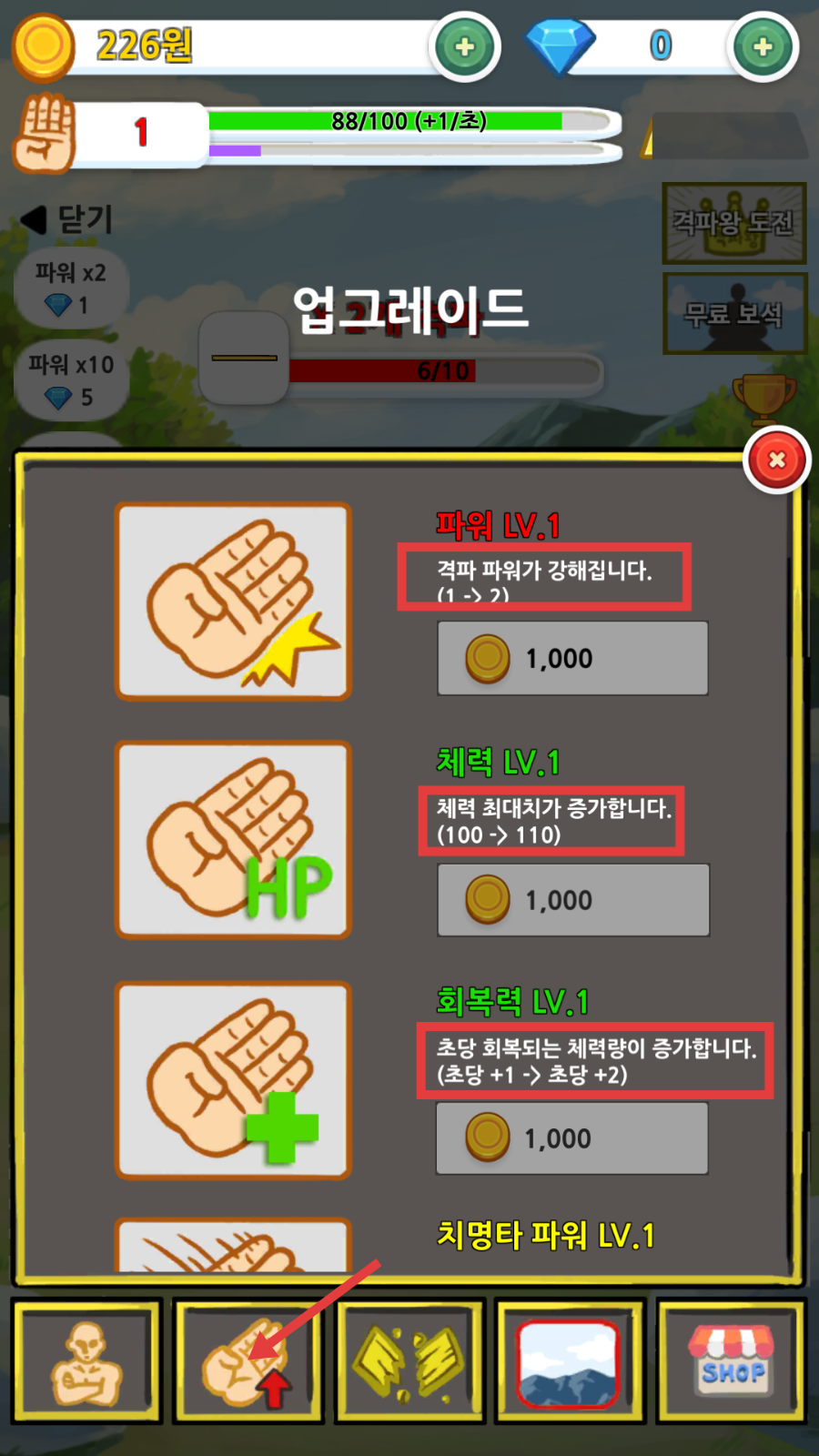 3、点击升级按钮,消耗【1000-金币】提升【力量】【体力】等属性,强化战斗能力。